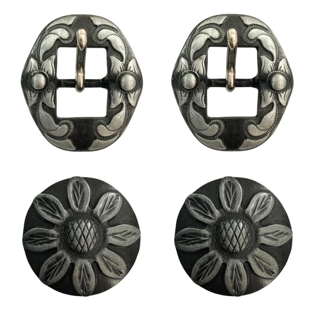 Acompanhando a fivela, as Margaridas Parafuso, com generosas 35 mm de largura, adicionam um toque de charme singular ao conjunto. Sua fabricação em zamac mantém a coerência de estilo com a fivela, enquanto o parafuso confere praticidade no momento de ajustar a cabeçada, além de contribuir para um visual esteticamente harmonioso.